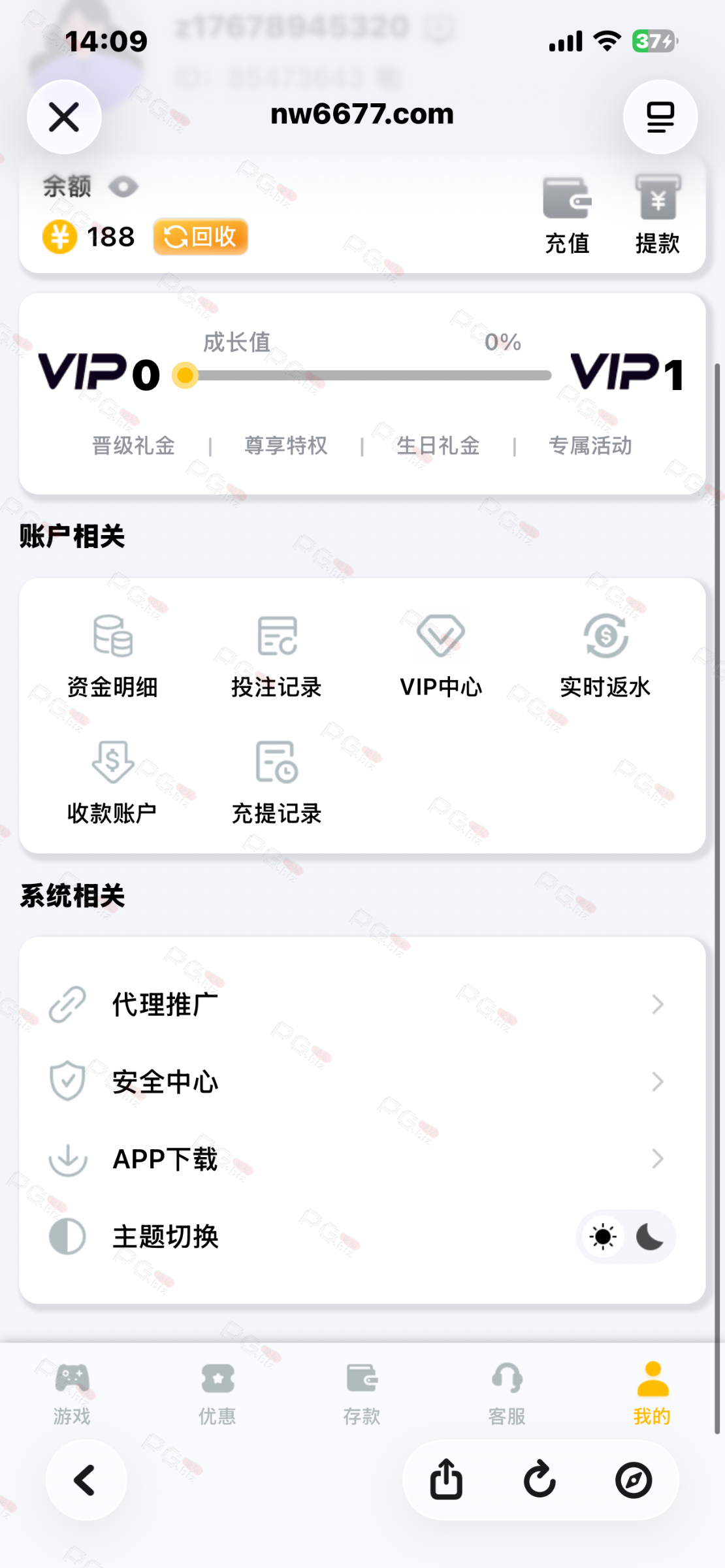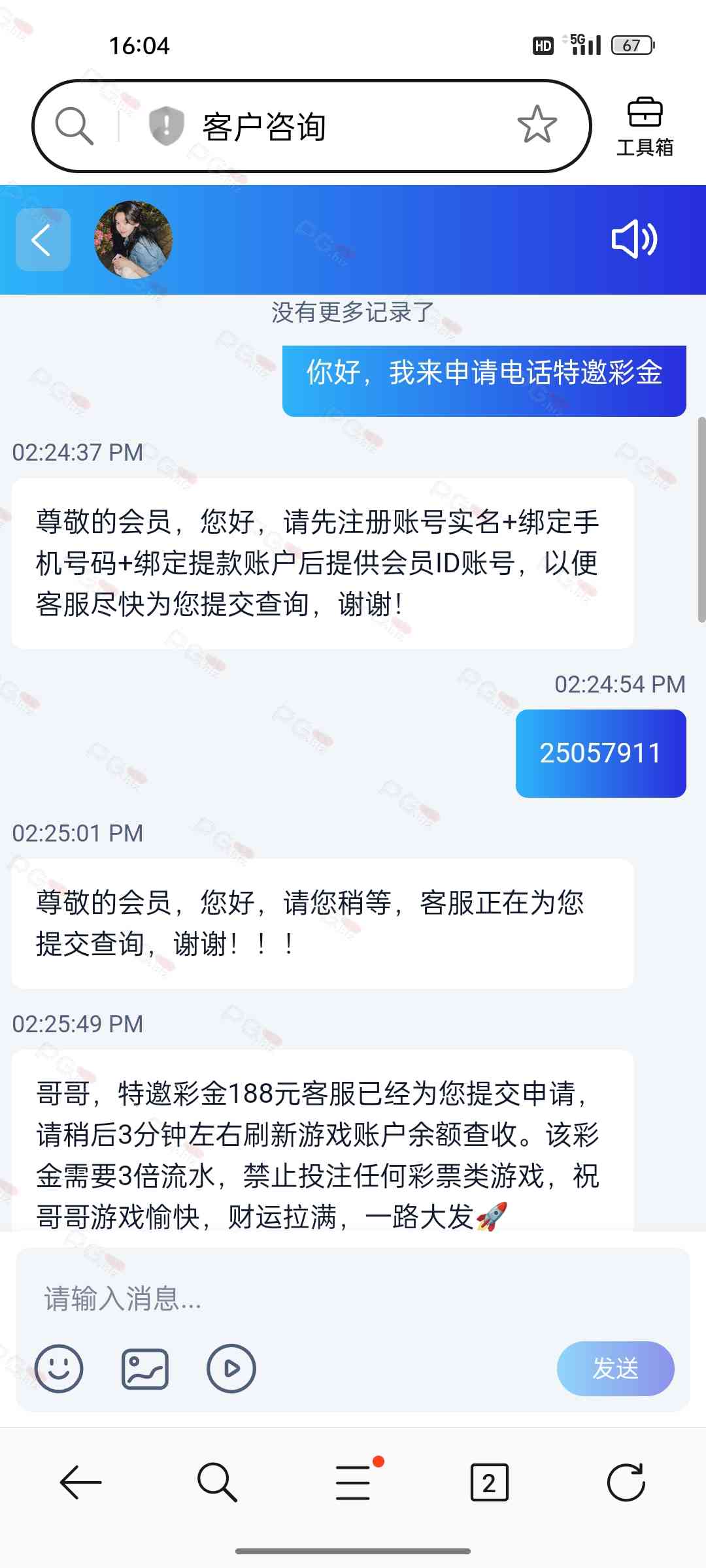 接到电话或者漏接的兄弟们可以去看看,注册账号联系在线客服申请,账号注册一个字母加手机号,然后注册好记得先绑定收款方式,这样比较快。在线客服回复很慢,耐心等待。188彩金没有游戏限制,3倍流水。